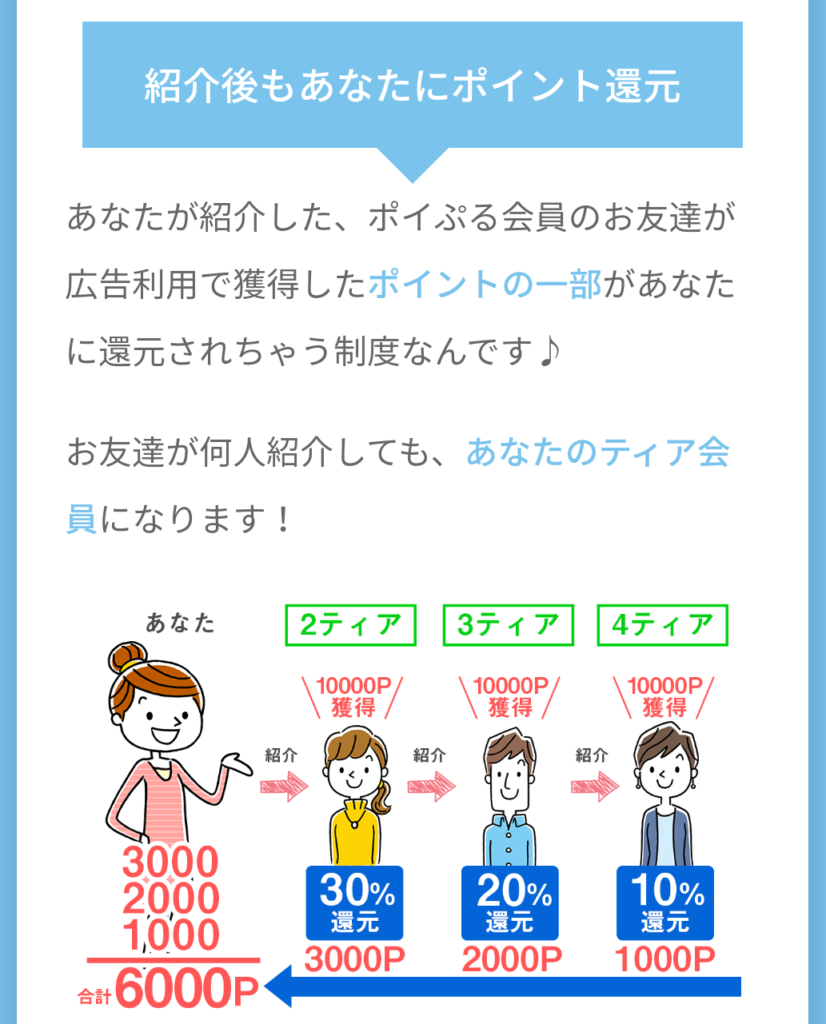 お友達の紹介制度があるので、ツイッターやフェイスブックのお友達に紹介してその人が登録してポイぷるを使った場合は、ポイントの一部が還元される制度があります。