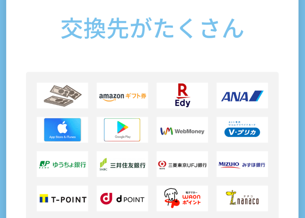 ポイぷるは、現金やギフト券、電子マネーに交換するとが
