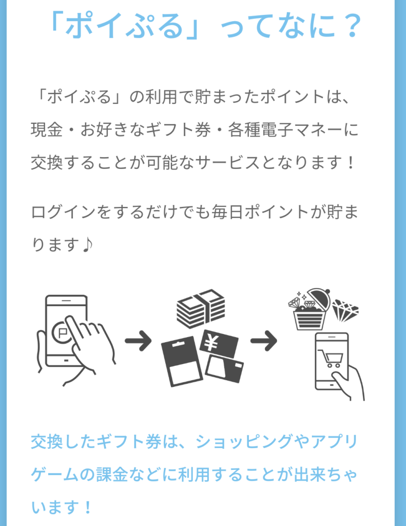「ポイぷる」の利用で貯まったポイントは、現金・お好きなギフト券・各種電子マネーに交換することが可能なサービスとなります。ログインをするだけでも毎日ポイントが貯まります。交換したギフト券は、ショッピングやアプリゲームの課金などに利用することが出来ます。