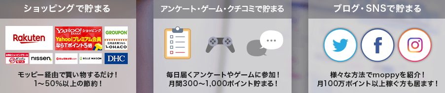 手っ取り早くポイントを貯めるには、アマゾンや楽天やヤフーなどのショッピングの広告です。普段の買い物をモッピー経由にするだけでポイントが貯まります。